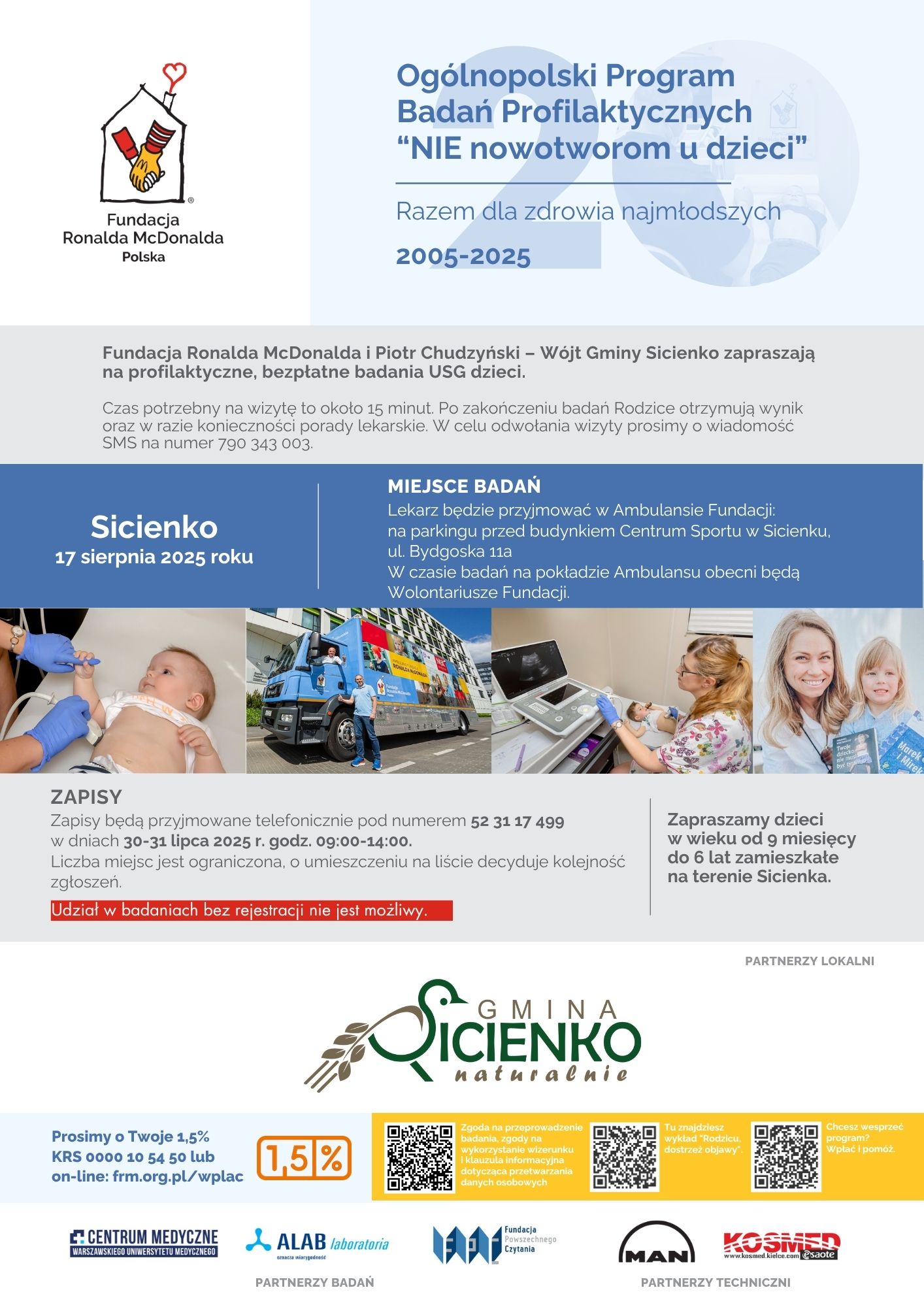 FundacjaRonaldaMcDonalda oraz Piotr Chudzyński – Wójt Gminy Sicienko zapraszają dzieci w wieku od 9 miesięcy do 6 lat z terenu Gminy Sicienko na profilaktyczne badania USG „NIE nowotworom u dzieci”.